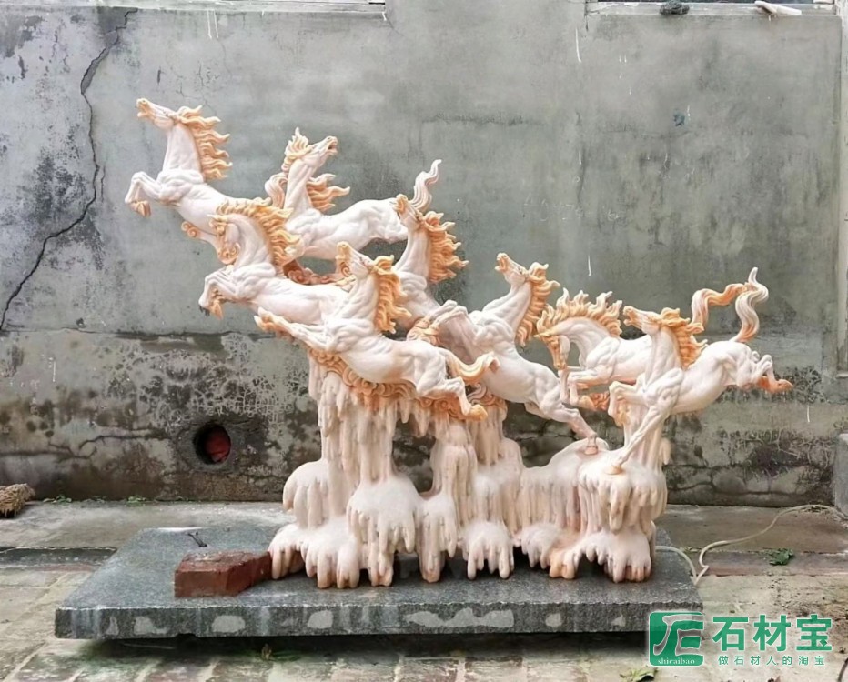 晚霞红精雕八骏图。