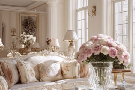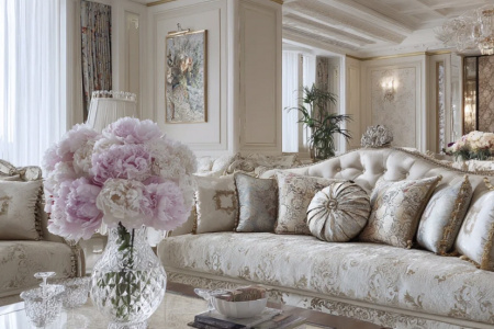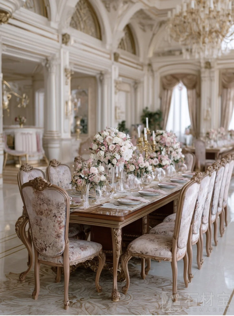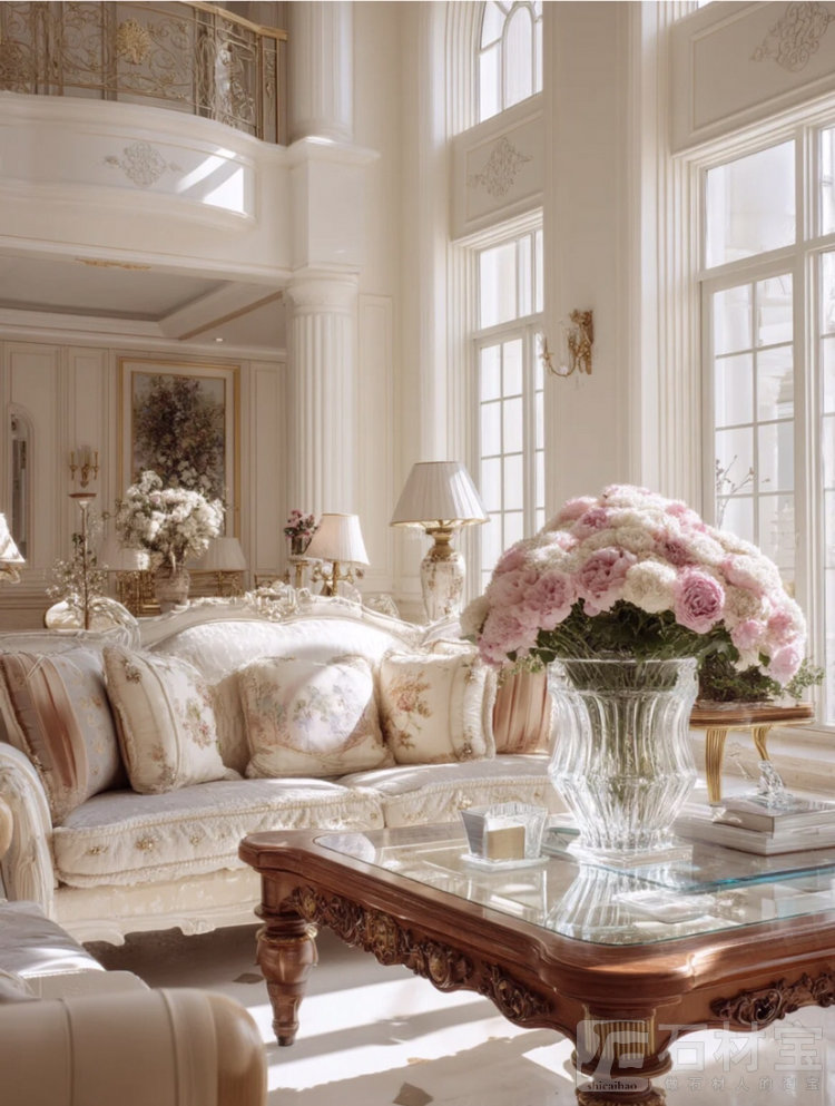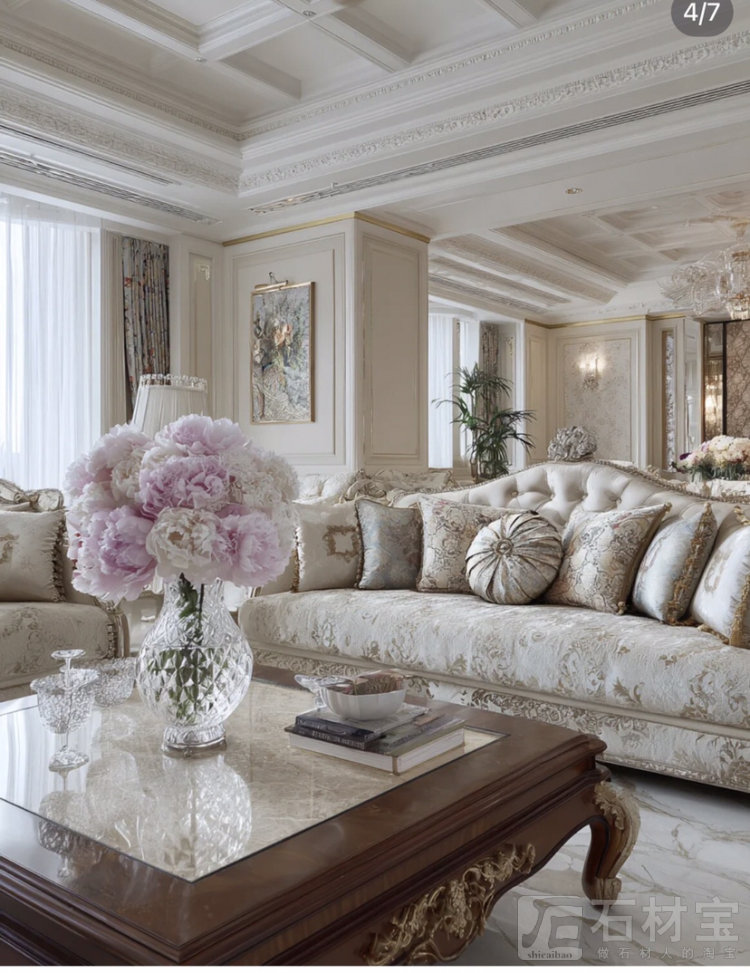 欧式风格装修效果图:推开客厅的门大气又好看 ——挑高的穹顶挂着双层的水晶吊灯,折射在“莎安娜”大理石拼花的地板上,像撒了把碎钻