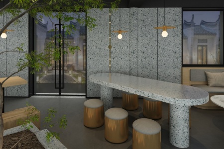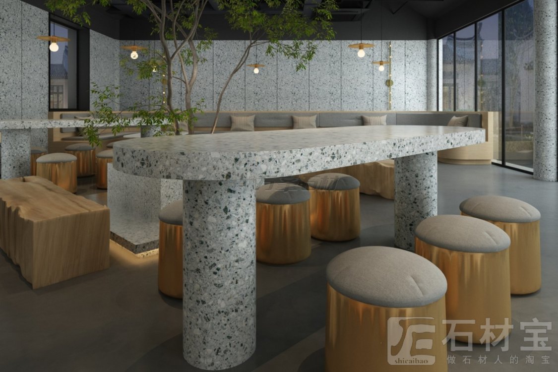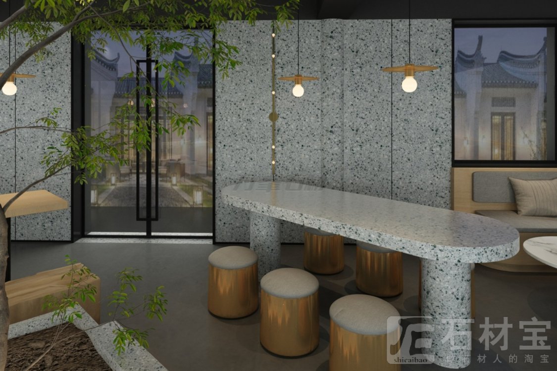 它是吧台长桌的底气:圆弧边角裹着雾面柔光,铜色圆凳一落,便成ins博主镜头里“侘寂+轻奢”的平衡术;亦是墙面的呼吸感:大尺寸板岩裁出利落线条,窗外黛瓦飞檐探入,新中式禅意顺着石纹漫开。
