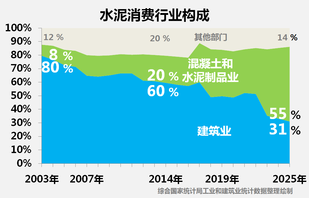 数据变化直观反映了这一结构转型。2003年,建筑业直接消费的水泥(占比80%)价值1292亿元,占当年建筑业非金属建材消费总额的34%;由工厂生产的商品混凝土和水泥制品(对应8%的水泥)价值534亿元,占比为14%。到2025年,建筑业直接消费的水泥(占比31%)价值2183亿元,在建筑业非金属建材消费总额中的占比降至7%;而经由工厂加工后供应的商品混凝土和水泥制品(对应55%的水泥)价值达1.25万亿元,占比上升至40%。