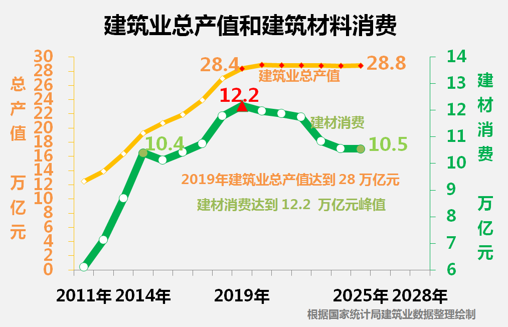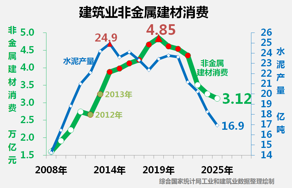 2014年全国水泥产量达到24.9亿吨峰值,建筑业建筑材料年消费值跨入10万亿元平台。2019年建筑业总产值达到28万亿元,建材消费达到12.2万亿元峰值。2023年以后建筑业建材消费结构变更和建材价格下降,2025年建筑业消费建筑材料10.5万亿元,回落至2014年水平。